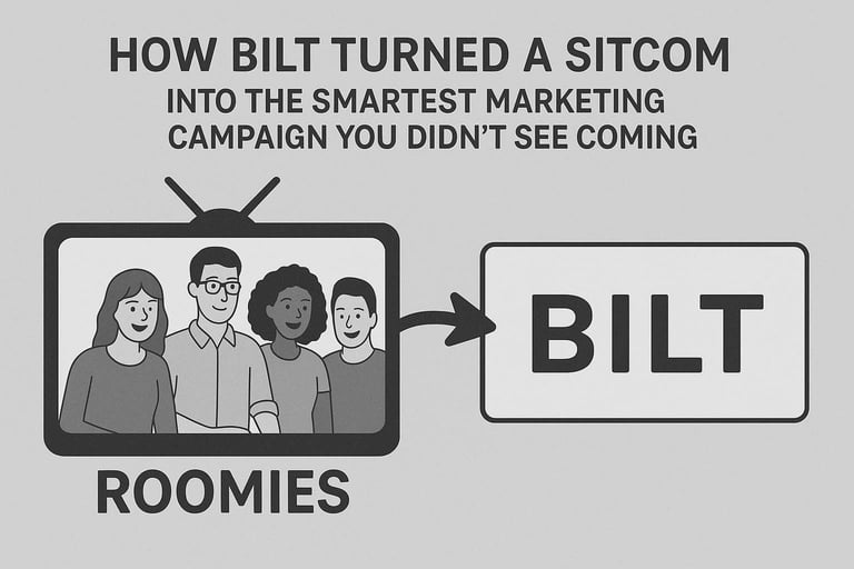 👉 Split-screen visual: left side = characters from Roomies, right side = Bilt Rewards app dashboard. Caption: “Behind the laughs: a smart brand play.”